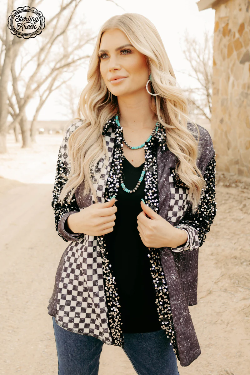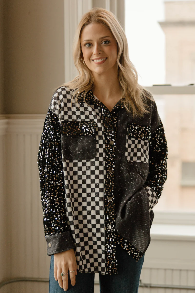 Unleash your inner fashionista with our Bad and Boujee Shacket. This versatile piece features a bold black and white checkered side and a luxe mineral wash black side, dressed up with velvet sequin arms and collar. A must-have for any trendsetter!"