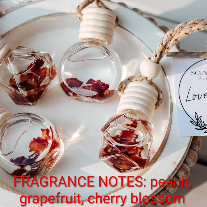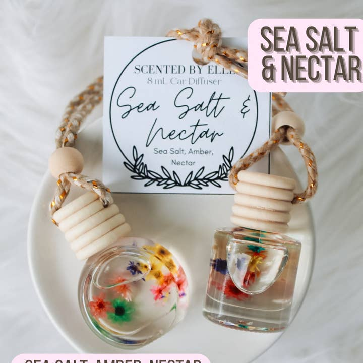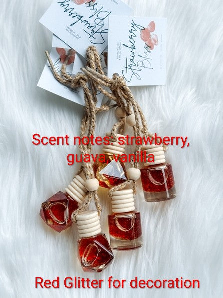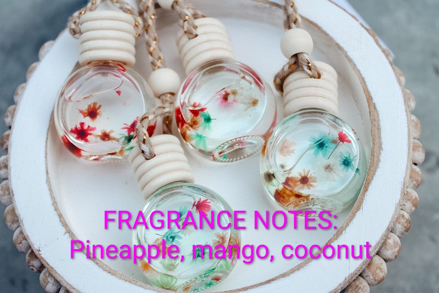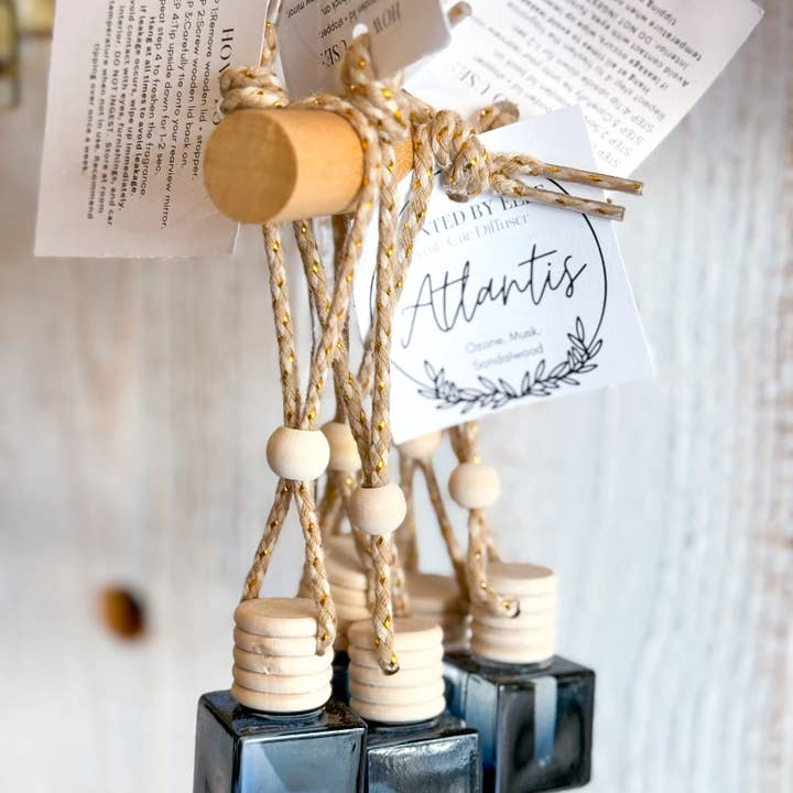 Each diffuser comes tagged with fragrance name, description of fragrance, and instructions on the back of the tag! Our car diffusers are made with the highest quality fragrance oils on the market. They are phthalate free and do not contain any of the harsh toxins that are found on the California Prop 65 list. Some diffusers contain decorative filler such as dried flowers, glitter, or clay figures. Please note that BOTTLE SHAPE MAY VARY.