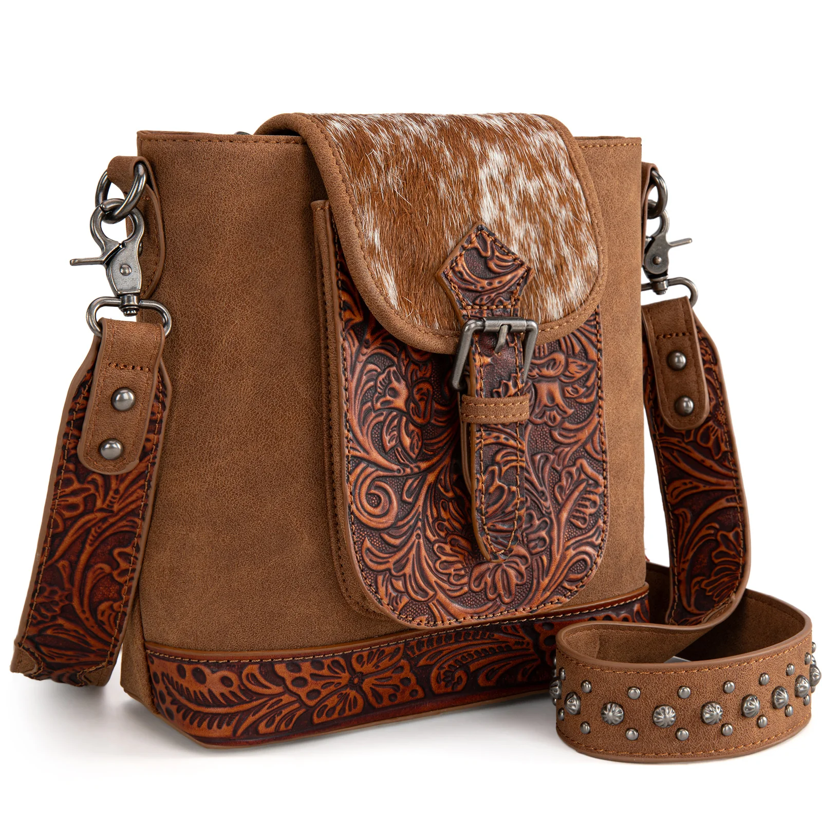 - Detachable floral tooled and studded crossbody strap (48")