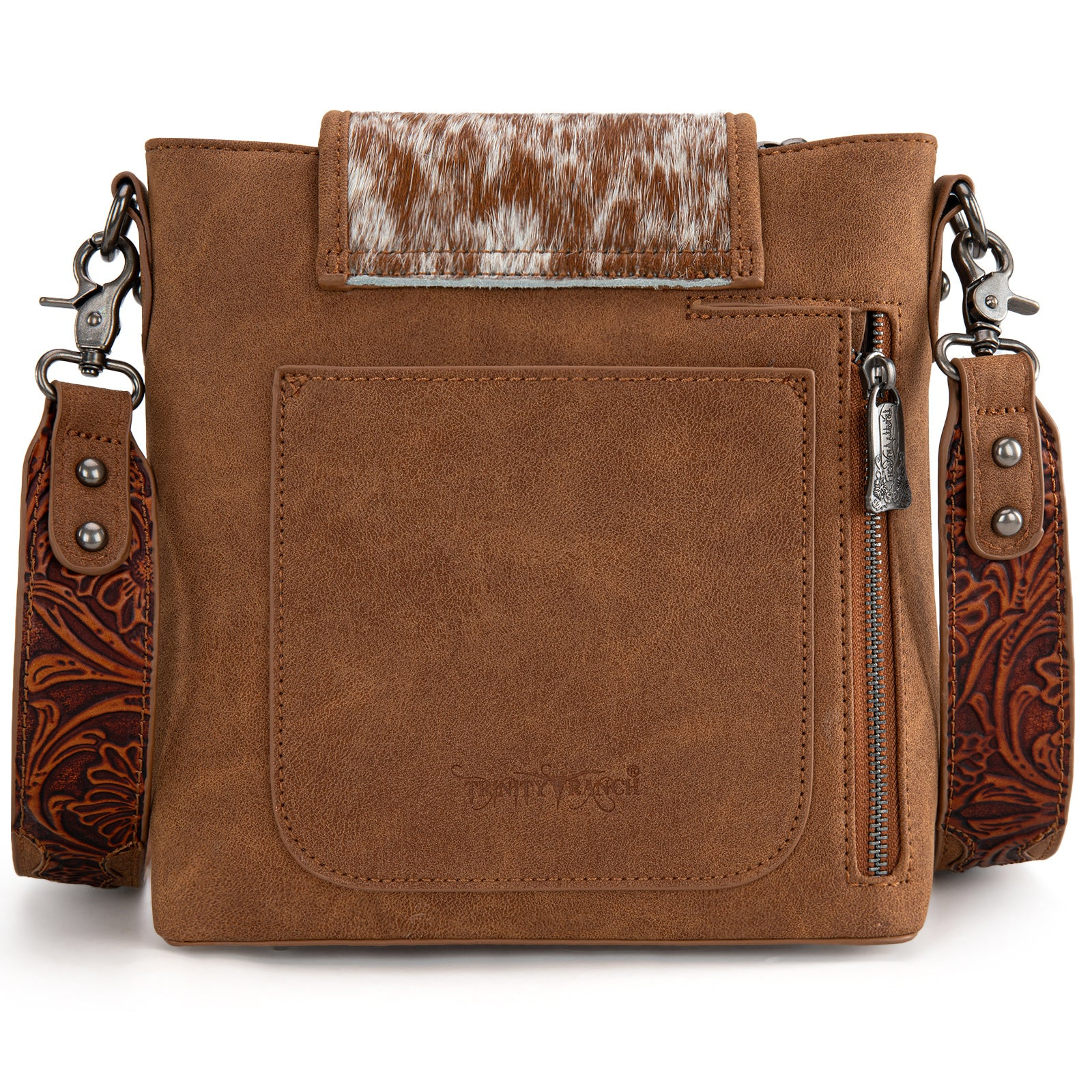 - Floral tooled and genuine hair-on cowhide