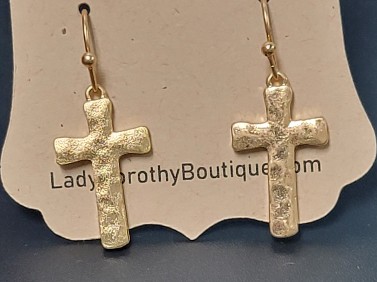Elevate your style with these Hammered Cross Earrings, measuring approximately 2 inches in length. Their distinctive hammered metal texture adds a handcrafted touch, creating eye-catching shimmer with every movement. Perfect for making a bold statement or adding an elegant edge to any outfit, these earrings combine timeless symbolism with modern design for versatile wear.