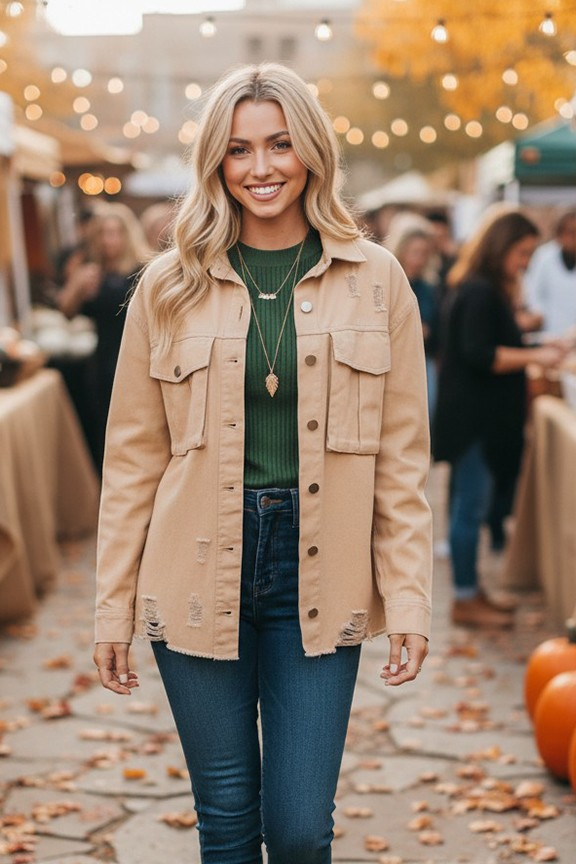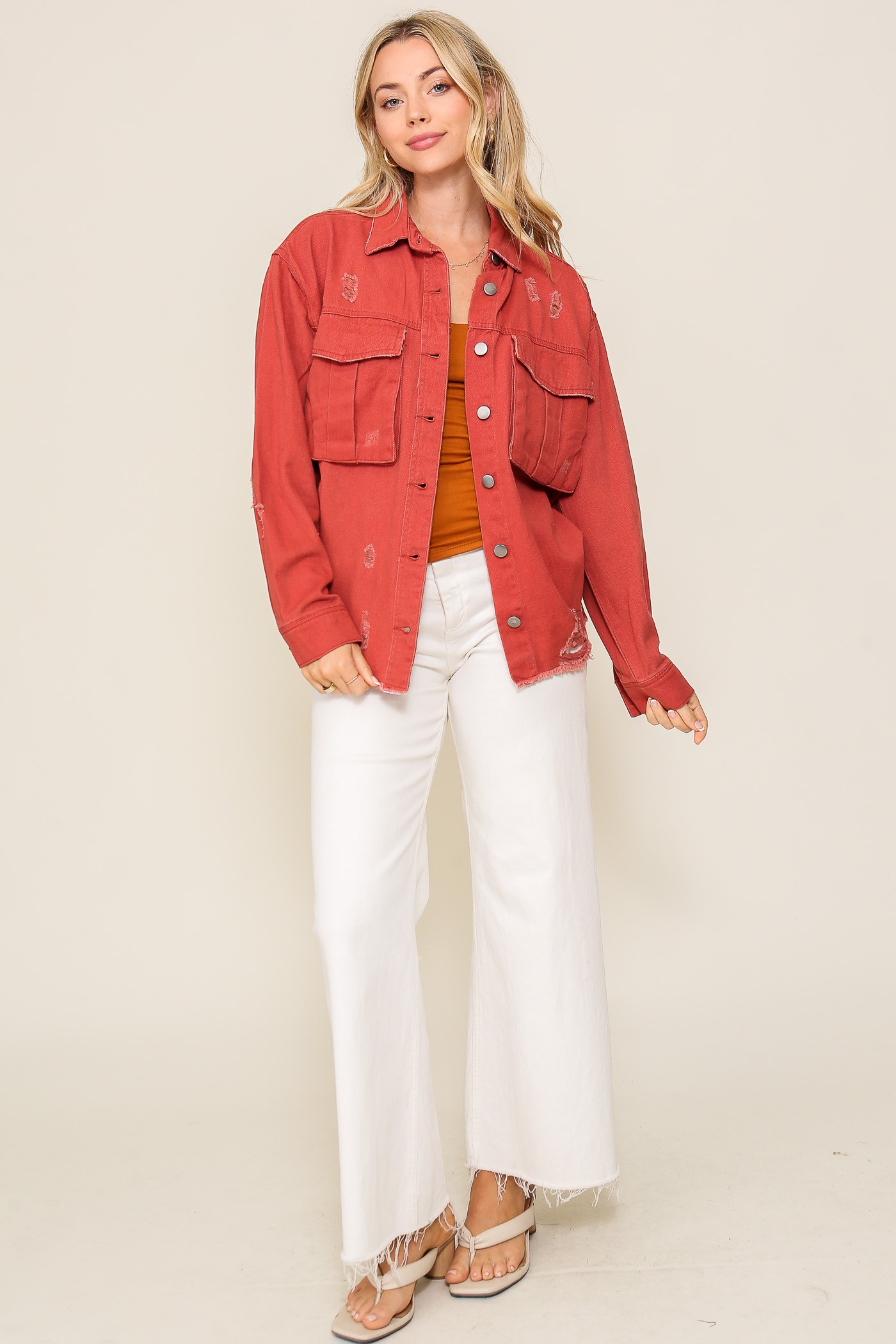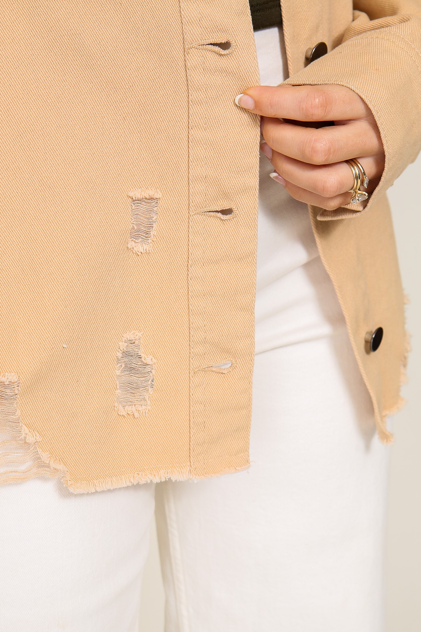 Denim jacket, with a distressed touch, spreading its charm. It gracefully dons an oversized silhouette, boasting a long sleeve design and button-down closure.