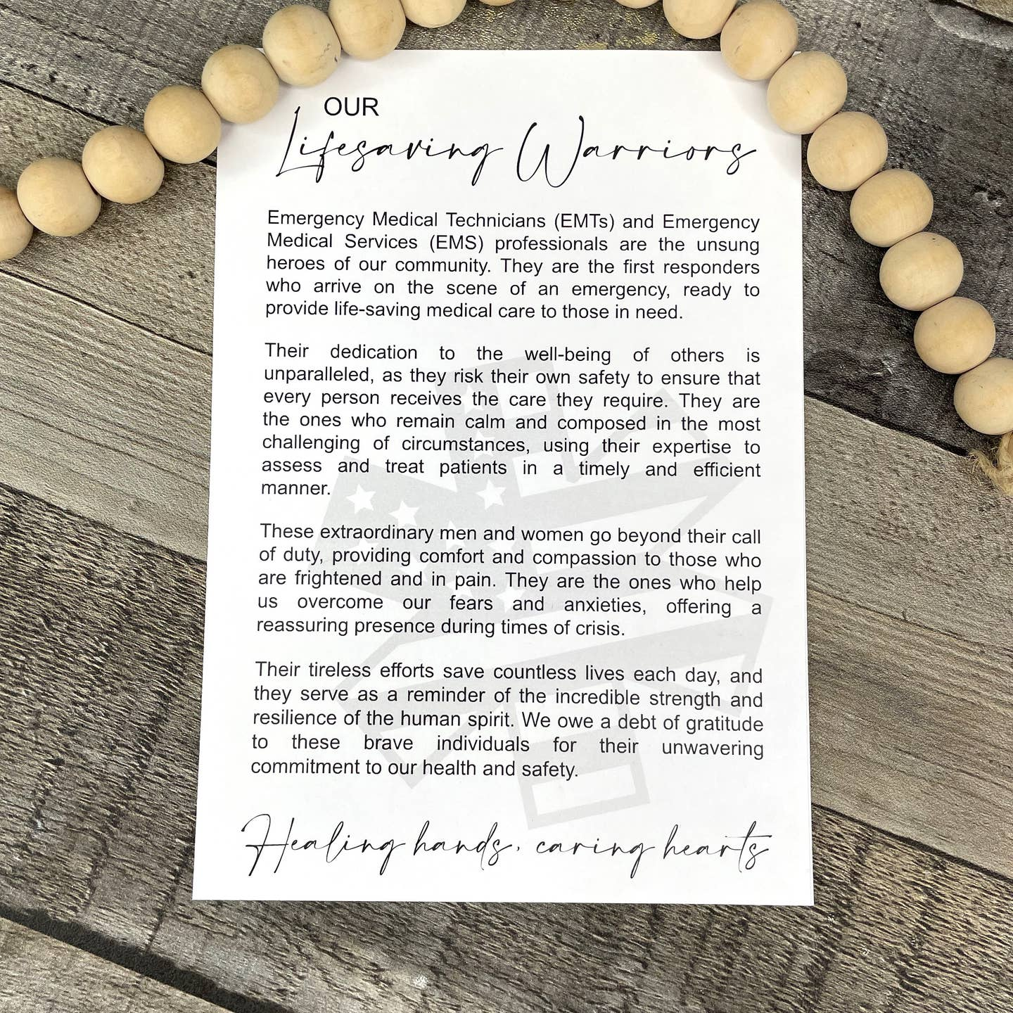 Emergency Medical Technicians (EMTs) and Emergency Medical Services (EMS) professionals are the unsung heroes of our community. They are the first responders who arrive on the scene of an emergency, ready to provide life-saving medical care to those in need. Their dedication to the well-being of others is unparalleled, as they risk their own safety to ensure that every person receives the care they require. A great gift. Card is 5" x 7" Ornament is approximately 3.5" x 4"