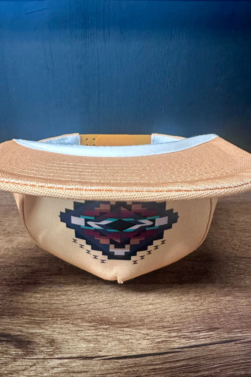 Add a splash of color and culture to your outfit with this mustard cap, featuring a vibrant turquoise band and a bold Aztec design at its center. Perfect for those who love playful style with a touch of tradition.