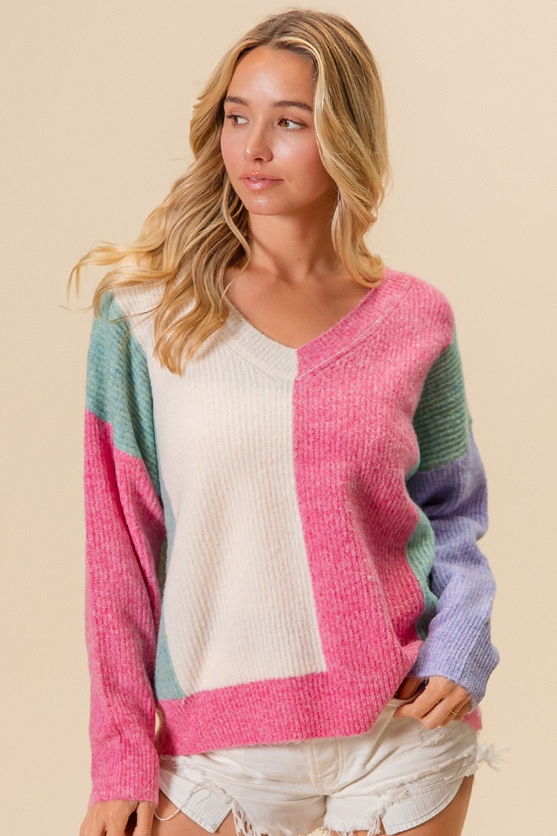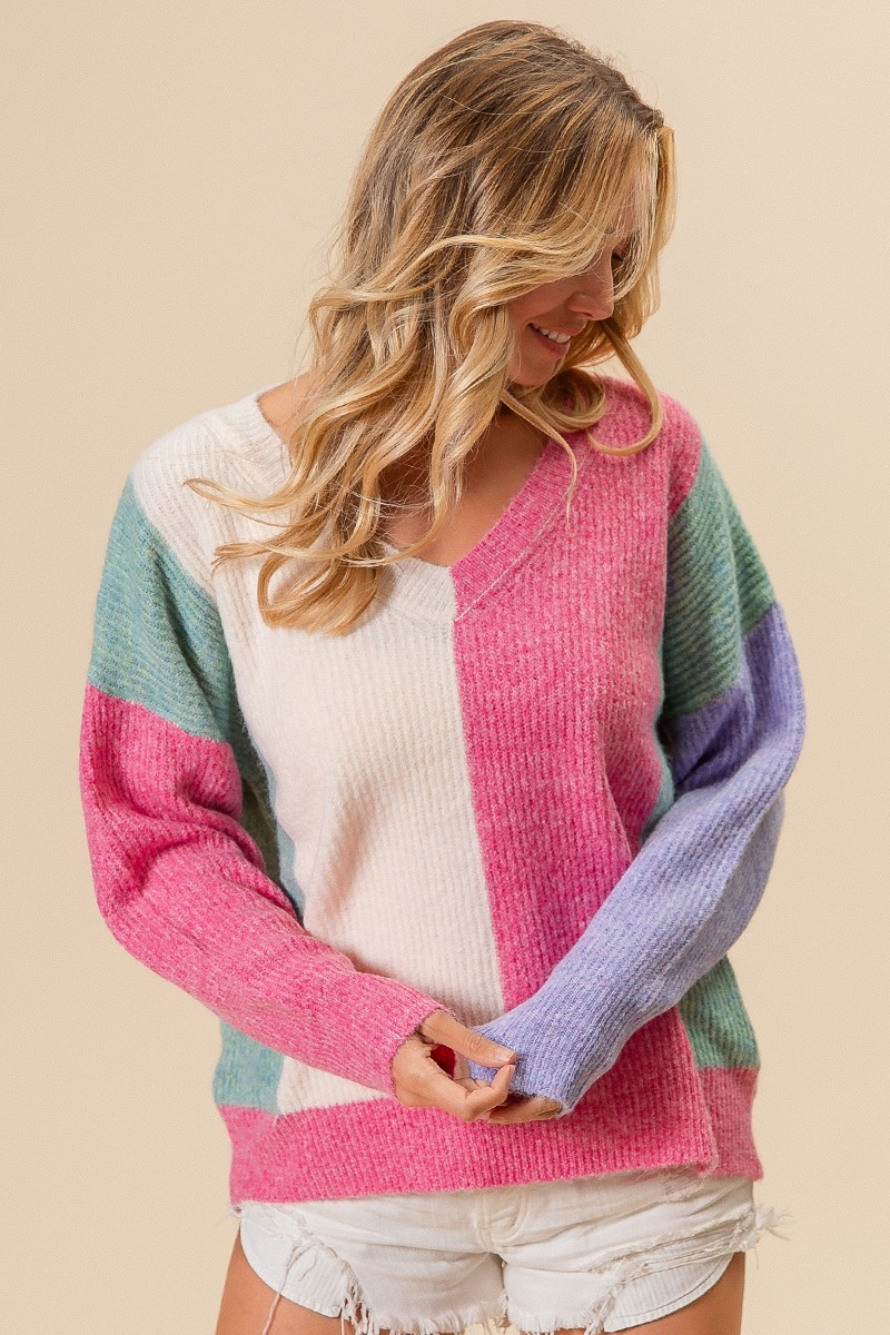 Indulge in the cozy texture of our V-neck color block sweater! With a beautiful combination of pink, sage, ivory, and blue, this sweater is perfect for adding a pop of color to your wardrobe. Stay warm and stylish all season long!