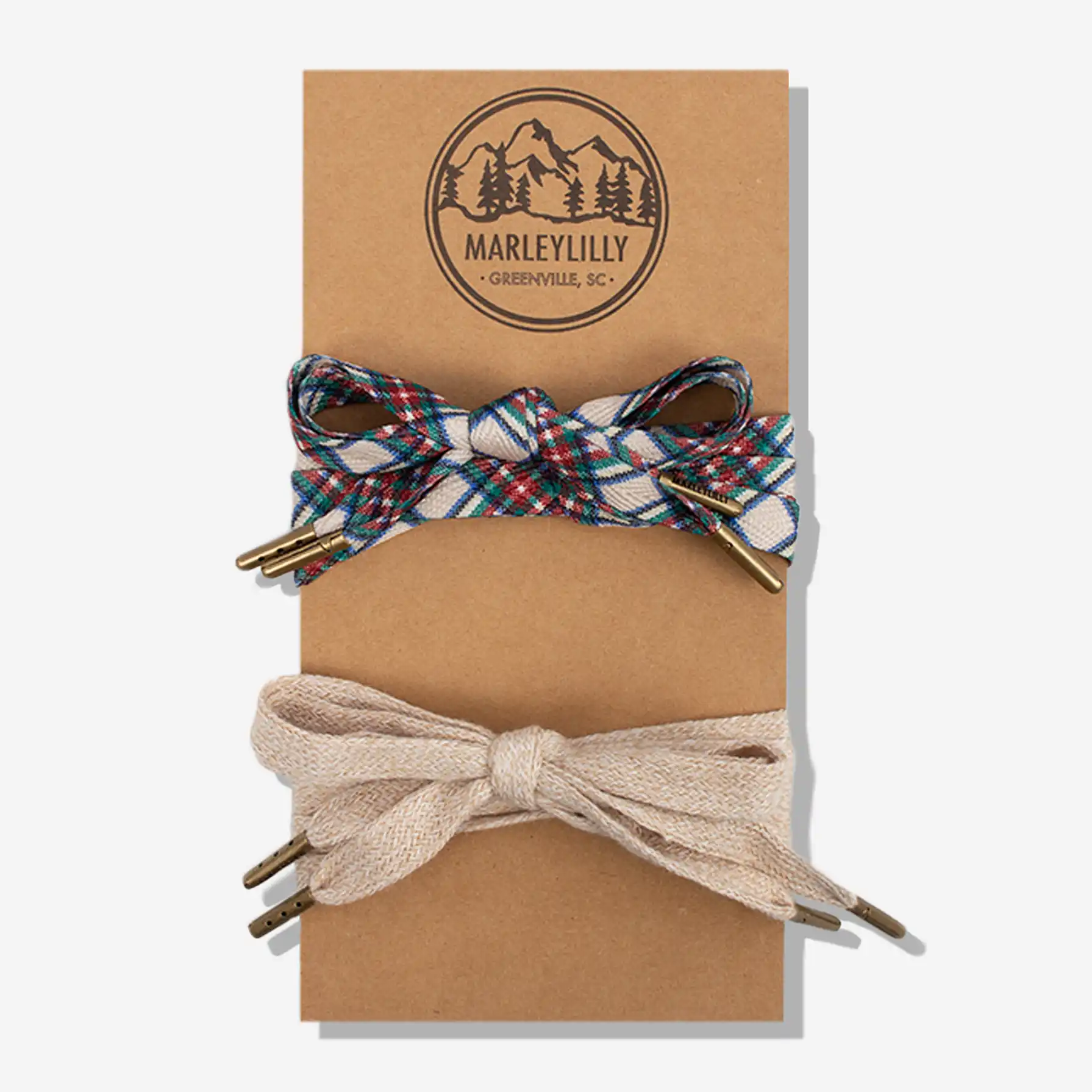 - Branded Marleylilly antiqued gold aglets are on the end of each lace.