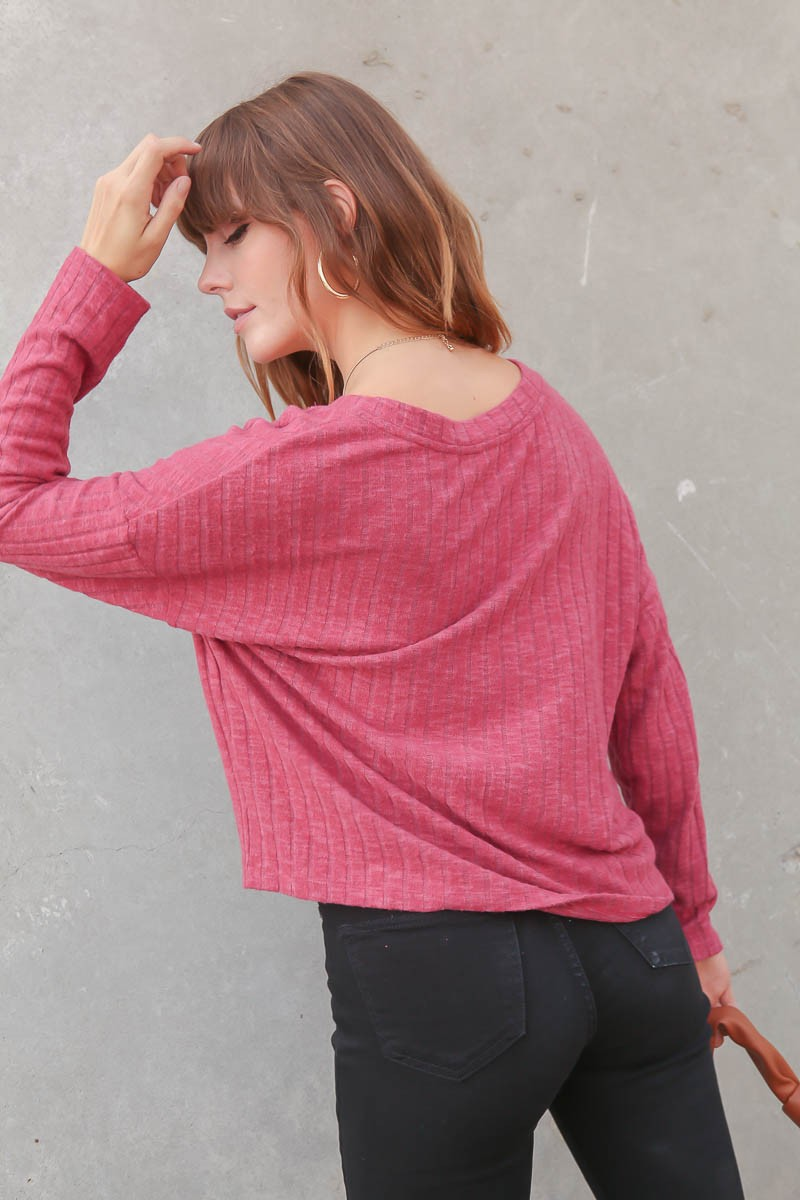 This chic long-sleeve top features a flattering V-neckline and a comfortable, relaxed fit. Made from a soft, ribbed knit fabric, it offers a touch of texture and drapes beautifully. Perfect for a casual yet stylish look, it can be easily dressed up or down.