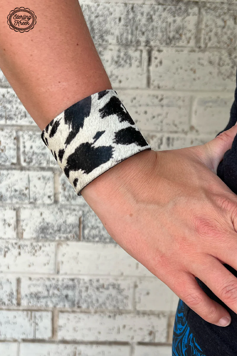 Giddy up in style with The Clarabelle Cuff! Crafted with sleek black and white cowhide, this cuff bracelet will give your arm candy a fashionable oomph! Lookin' to moooo-ve up your style game? Slip this stylish bovine-printed bracelet on and you'll be ready to stampede the competition.