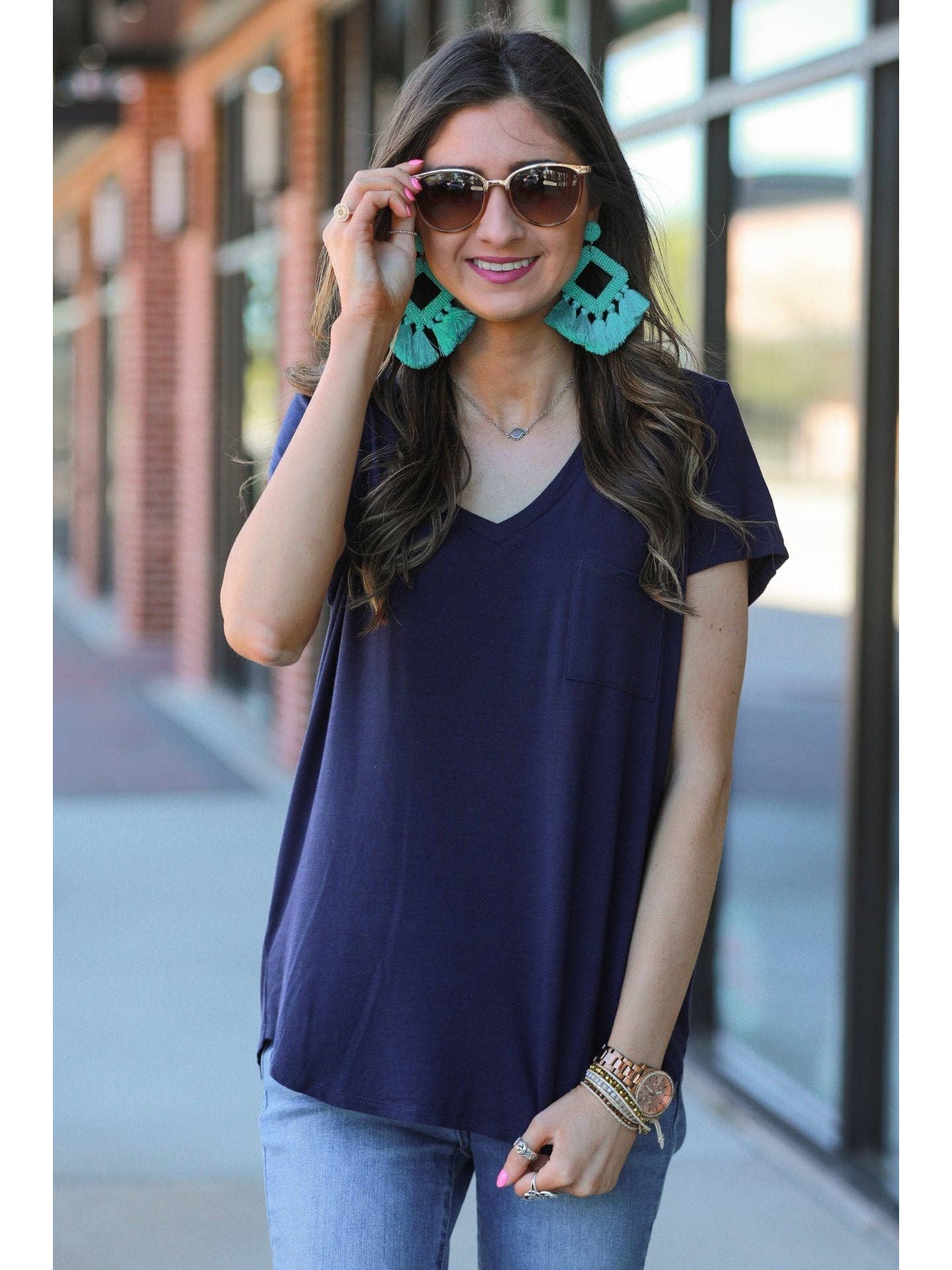 We know we're always on the lookout for a good, comfy basic! This basic tee is definitely one of those pieces! It's comfy and a perfect fit that makes it so easy to wear and the colors make styling and layering it a breeze! This top features short sleeves, a v-neck, and a rounded hemline.